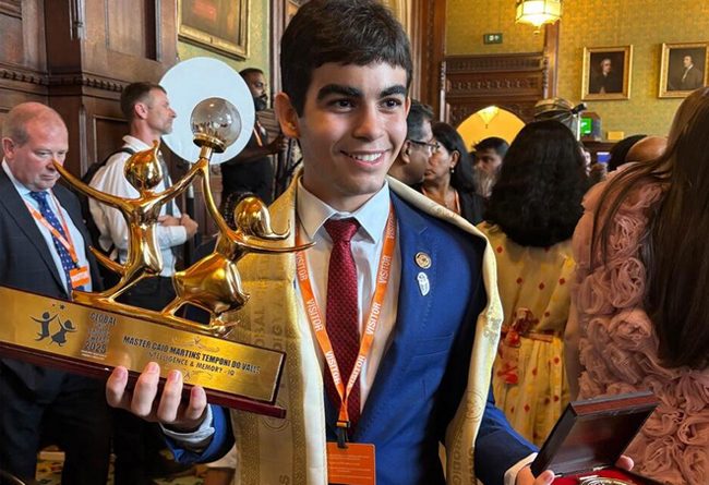 O jovem brasileiro Caio Temponi, de apenas 16 anos, recebeu no último dia 26 de junho, em Londres, o prêmio Global Child Prodigy Awards (GCP Awards), sendo reconhecido como um dos 100 prodígios mundiais de 2025 na categoria “Inteligência e memória – QI”.