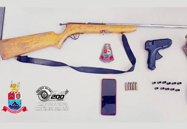 Com o apoio do Comando de Força Patrulha (CFP) e demais equipes, o indivíduo foi abordado e submetido à busca pessoal. Durante a revista, foi encontrado um simulacro de pistola em um coldre de couro, 5 munições intactas de revólver calibre 38 e 11 munições deflagradas do mesmo calibre. Na parte interna da residência, apoiada no muro ao lado da porta, foi localizada uma carabina.