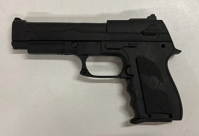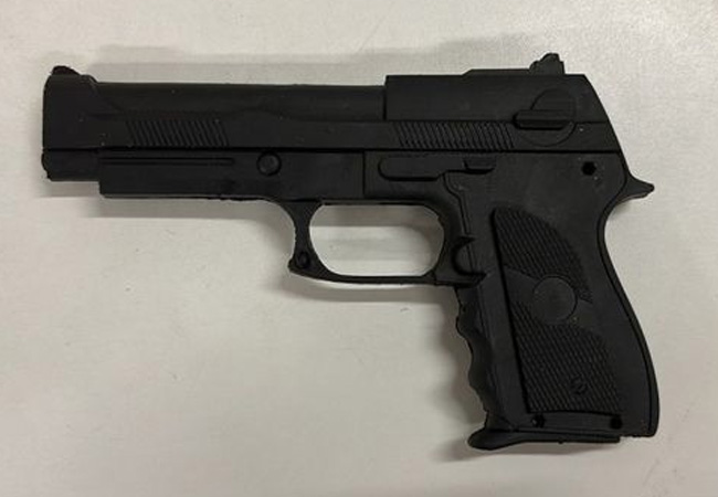 Durante a busca pessoal, os agentes encontraram um simulacro de arma de fogo escondido nas vestes do homem.