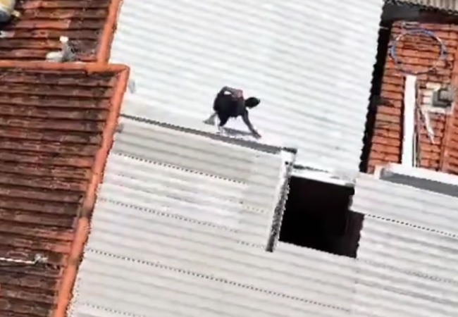 Ao perceber a presença policial, ele tentou fugir, trancando-se inicialmente em um imóvel e, em seguida, invadindo uma residência vizinha, onde escalou até a cobertura, em local de aproximadamente 20 metros de altura, oferecendo risco iminente de queda. Diante da situação, foi realizado cerco policial nas extremidades da viela, com apoio de aeronave remotamente pilotada (drone), possibilitando o monitoramento do local e a visualização do ponto onde o criminoso se encontrava.