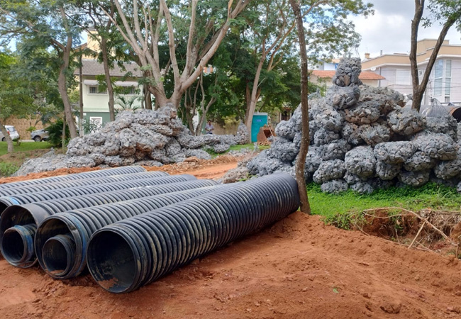 Outro destaque da obra é o alargamento e rebaixamento do córrego. Antes era de 1,5 a 2 metros de largura. A obra está permitindo uma largura de 7 metros por 4 de profundidade, o que vai amortecer muito a chuva e evitar que a água chegue tão rápido ao rio Atibaia, dando mais tempo para vazão.