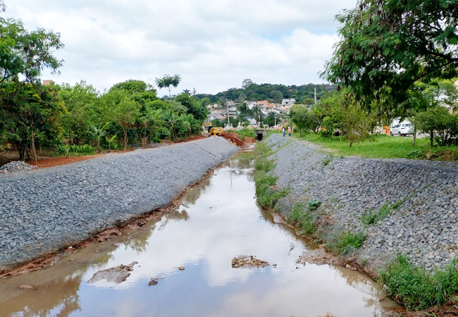 Outro destaque da obra é o alargamento e rebaixamento do córrego. Antes era de 1,5 a 2 metros de largura. A obra está permitindo uma largura de 7 metros por 4 de profundidade, o que vai amortecer muito a chuva e evitar que a água chegue tão rápido ao rio Atibaia, dando mais tempo para vazão.